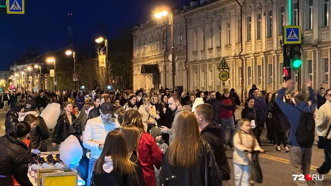 Жители Тюмени и гости города массово движутся в сторону набережной. Рядом с ней образовалась огромная очередь из желающих посмотреть на праздничный салют. Затрудняет их быстрое движение стоящие рамки и досмотр.