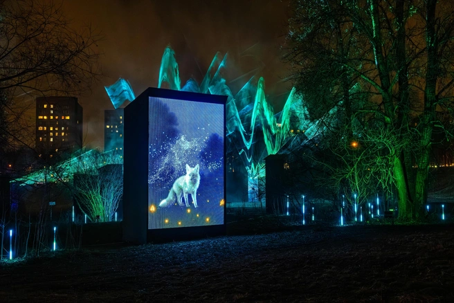 Каждый день гостей площадки ждет световое шоу. В центре площадки по-новому «зажжется» и легендарный костер. Теперь эта инсталляция, выполненная в художественном стиле, станет частью световой постановки, соединяя историю Дворца пионеров с современной городской культурой. А в парковой зоне гости смогут увидеть северное сияние и встретить животных, которые будто появляются среди деревьев и кустов.