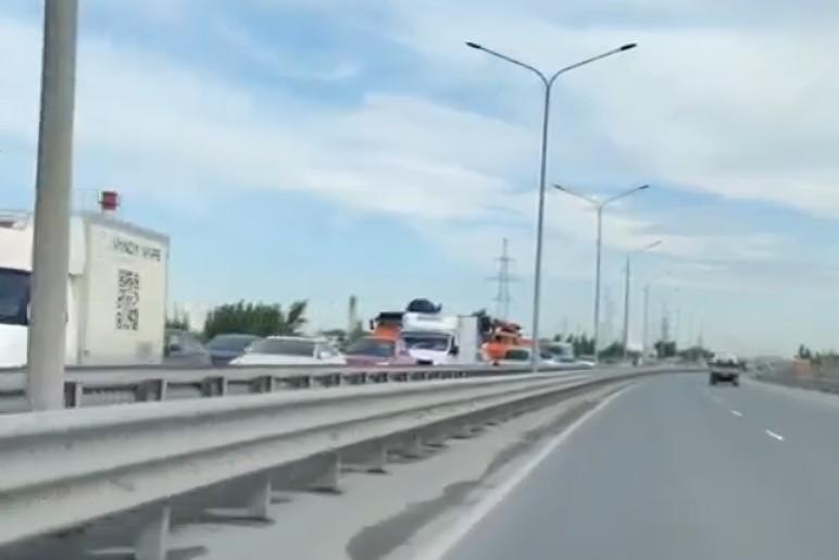 На мосту в Тюмени большегруз снес дорожную раму — видео с места ЧПНа месте происшествия образовалась пробка