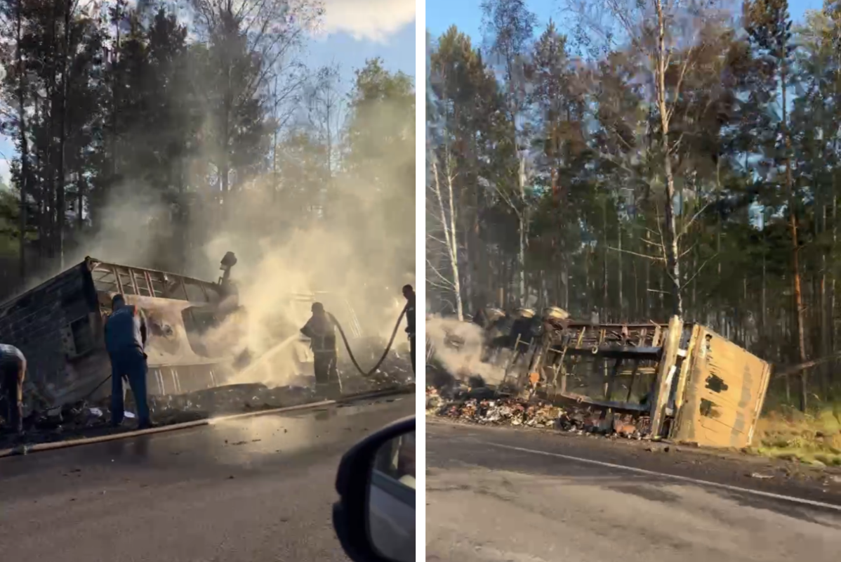 Перевернутая фура догорает на обочине — жуткие кадры ДТП под ТюменьюДвижение по трассе ограничено