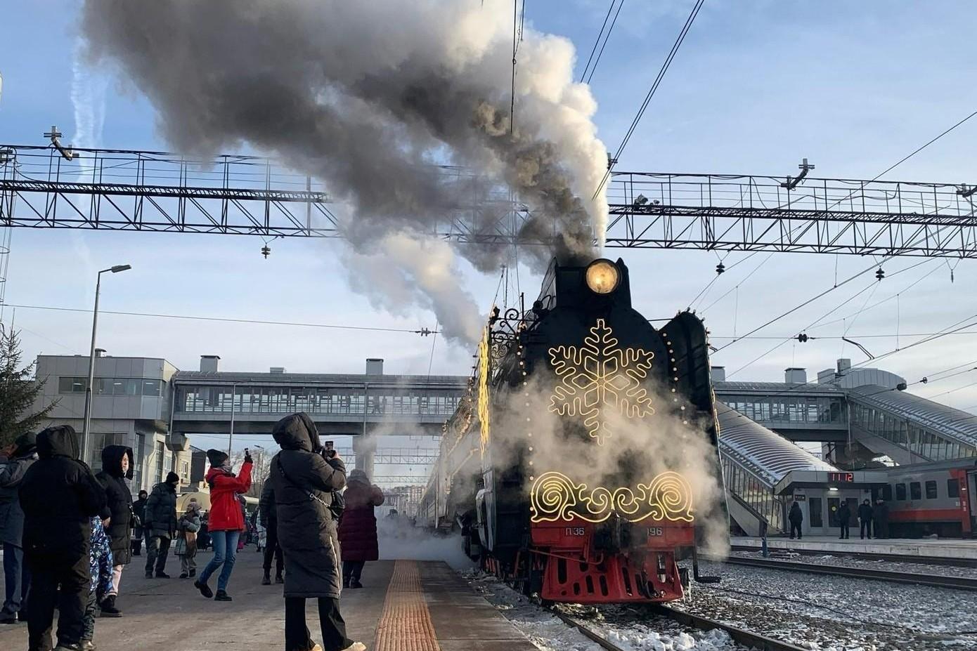 На перроне — яблоку негде упасть. В Тюмень прибыл долгожданный поезд Деда МорозаПосле длительной остановки он отправится дальше по маршруту