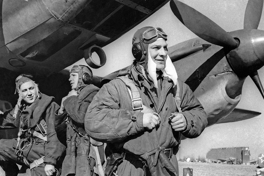 По данным из военных архивов, фотограф запечатлел экипаж бомбардировщика Пе-2 перед вылетом на Берлин.